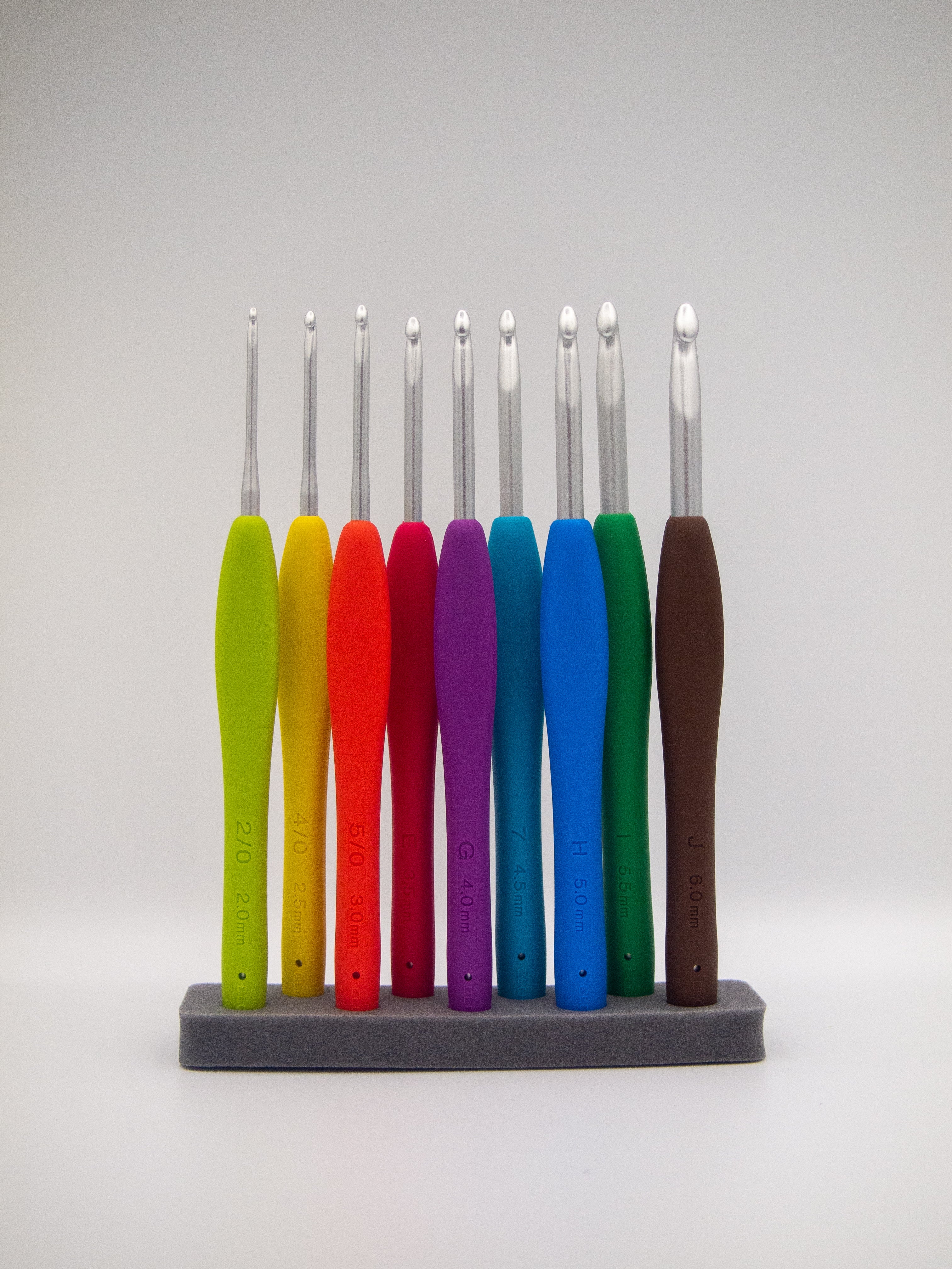 Clover Amour hook set including nine crochet hooks in sizes: 2mm, 2.5mm, 3mm, 3.5mm, 4mm, 4.5mm, 5mm, 5.5mm & 6mm.